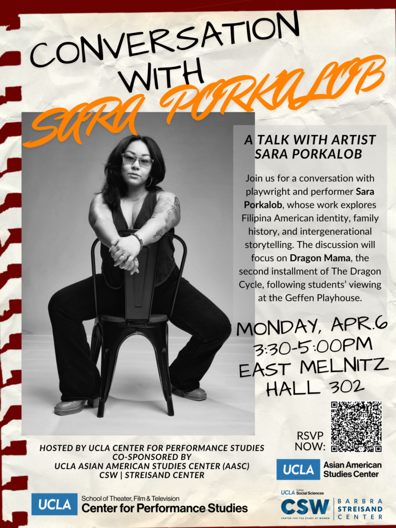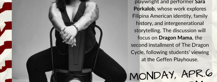 Join us for a causal conversation with playwright and performer Sara Porkalob, whose work explores Filipina-American identity, family history, and intergenerational storytelling. The discussion will focus on Dragon Mama, the second installment of The Dragon Cycle, following students’ viewing at the Geffen Playhouse.
