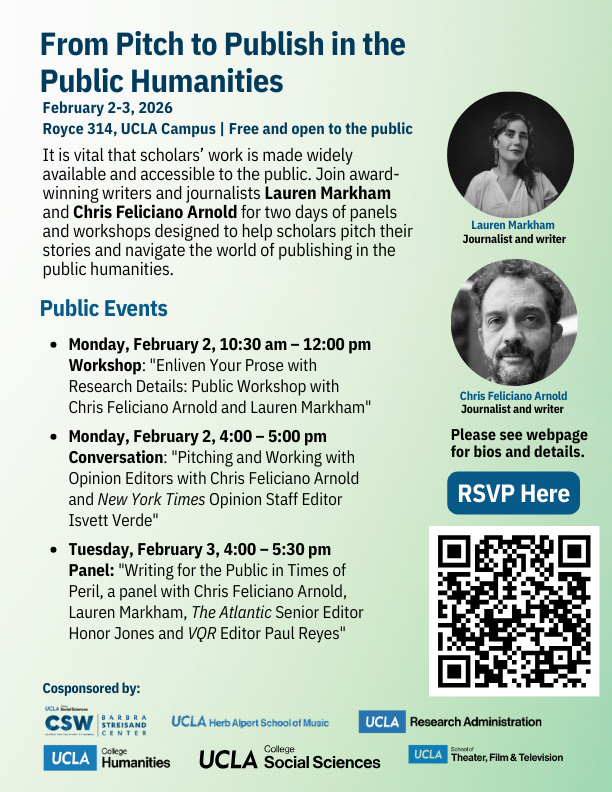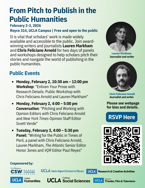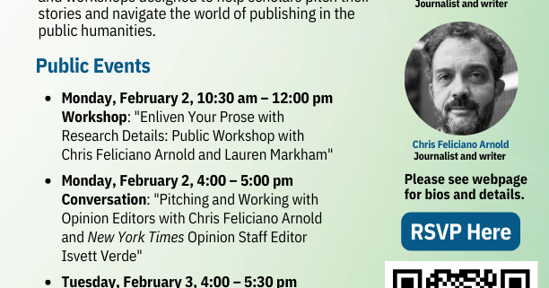 Today, it is vital that scholars’ work is made widely available and accessible to the public. Is your research part of the public discourse? Do you have stories the public at large would benefit from knowing? Do you want to reach a broader audience, an audience beyond the peer-reviewed academic outlets? Do you want to learn how to pitch your specific story and research to non-academic publications? We have invited two writers and journalists, Lauren Markham and Chris Feliciano Arnold, to offer insights on the public humanities writing, pitching, and publication process in a series of panels, workshops, and individual feedback sessions.