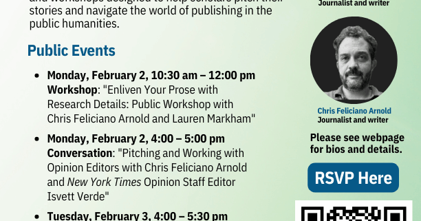 Today, it is vital that scholars’ work is made widely available and accessible to the public. Is your research part of the public discourse? Do you have stories the public at large would benefit from knowing? Do you want to reach a broader audience, an audience beyond the peer-reviewed academic outlets? Do you want to learn how to pitch your specific story and research to non-academic publications? We have invited two writers and journalists, Lauren Markham and Chris Feliciano Arnold, to offer insights on the public humanities writing, pitching, and publication process in a series of panels, workshops, and individual feedback sessions.