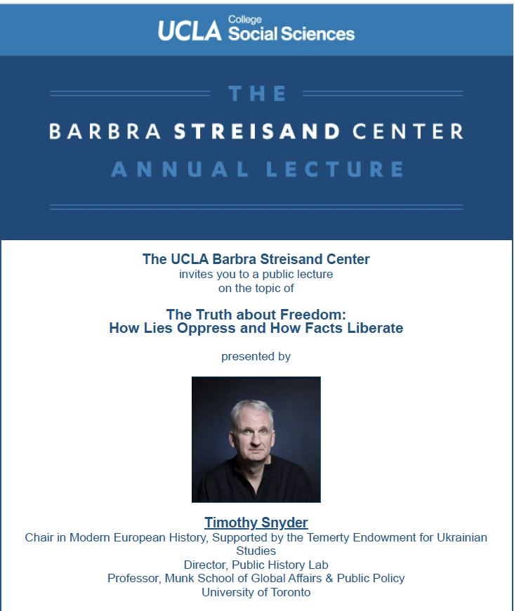 Timothy Snyder, Chair in Modern European History is giving a public lecture at UCLA CNSI on the topic, The Truth about Freedom: How Lies Oppress and How Facts Liberate. He is supported by the Temerty Endowment for Ukrainian Studies Director and is involved with Public History, Munk School of Global Affairs & Public Policy University of Toronto. Additionally, Synder is the bestselling author of “On Tyranny: Twenty Lessons from the Twentieth Century” and “On Freedom”. Copies of Timothy Snyder’s book “On Freedom” will be available for purchase and signature.